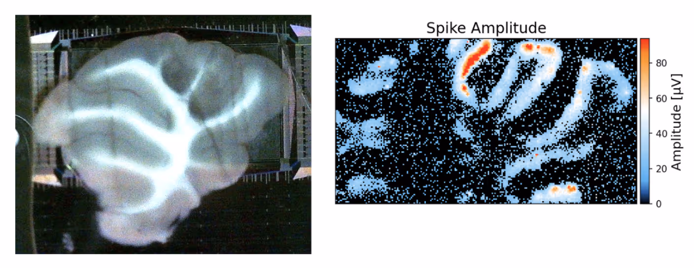 Left: Brightfield image of an acute cerebellar slice positioned on the MaxOne HD-MEA chip.