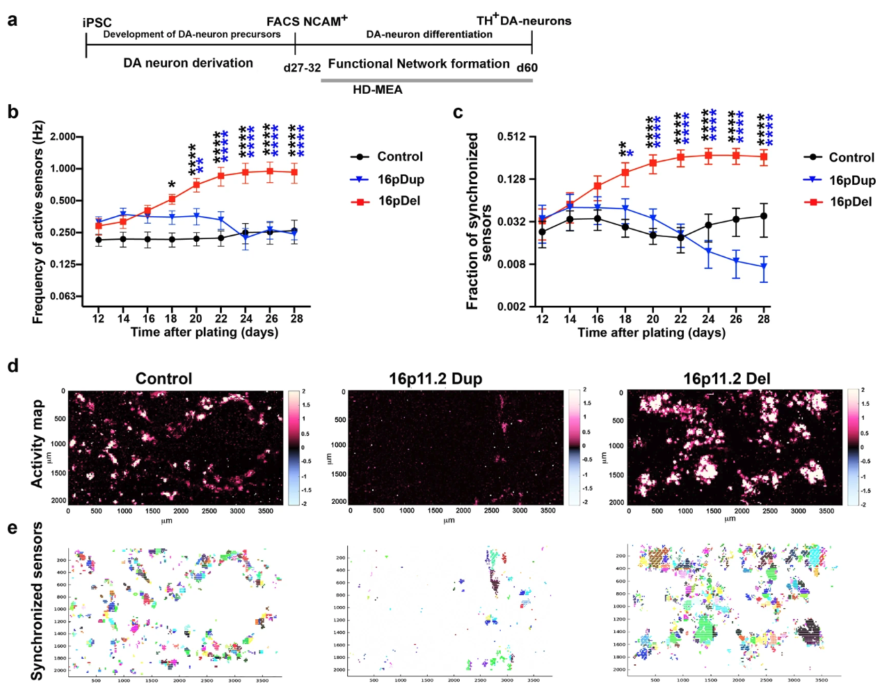 This study utilized the MaxTwo multi-well HD-MEA system to characterize iPSC-derived dopaminergic neurons with 16p11.2 duplication and deletion, genetic variants associated with schizophrenia, autism spectrum disorder and ADHD. Longitudinal recordings revealed pronounced hyperactivity and increased network synchrony in 16p11.2 deletion cultures compared to controls and duplication lines. MaxWell Biosystems’ platform provided sensitive and highly reproducible detection of genotype-specific network phenotypes, enabling robust identification of disease-related functional changes over time. Read more in Sundberg et al., Nat. Comm., 2021.