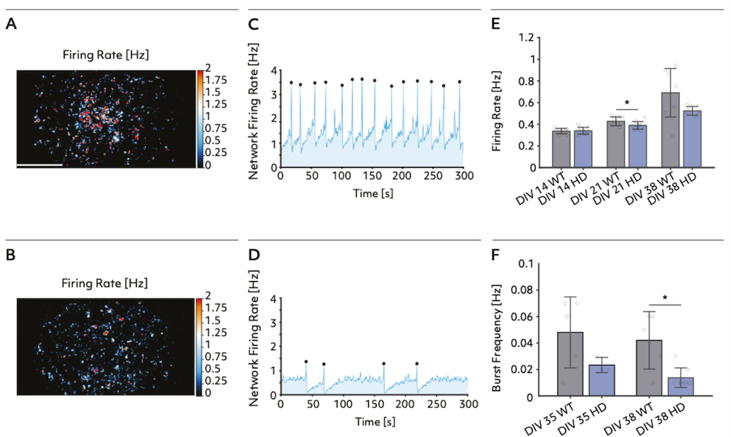 Top: Firing rate distribution maps and network activity traces show reduced neural activity and burst frequency in Huntington’s disease model neurons (HD) compared to wild type (WT) at DIV 38.