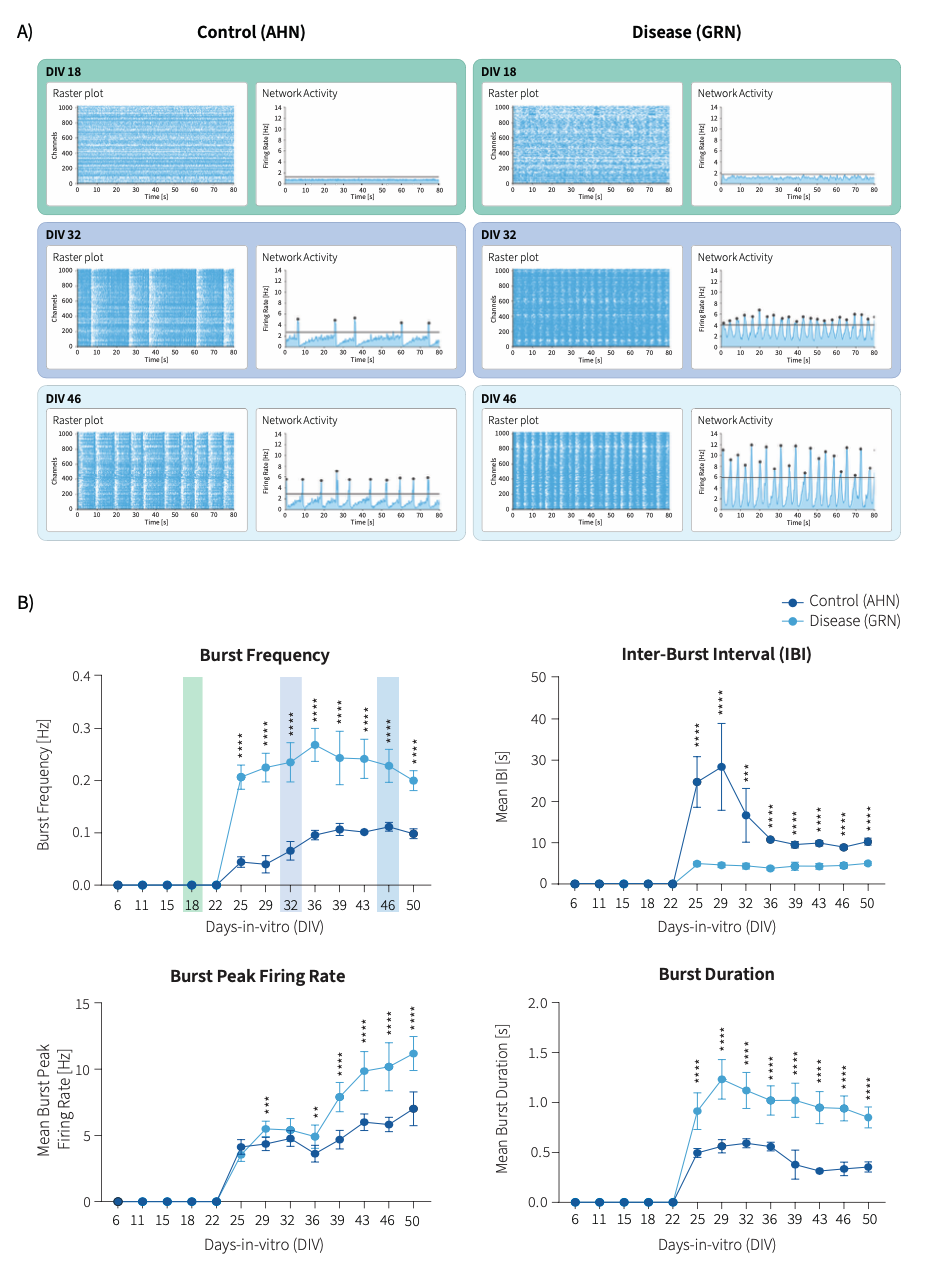 Top: Representative raster and network activity plots at DIV 18, 32, and 46 illustrate reproducible differences in activity and burst structure between FTD (featuring a heterozygous knockout mutation in the progranulin (GRN) gene) and control (AHN) cultures.