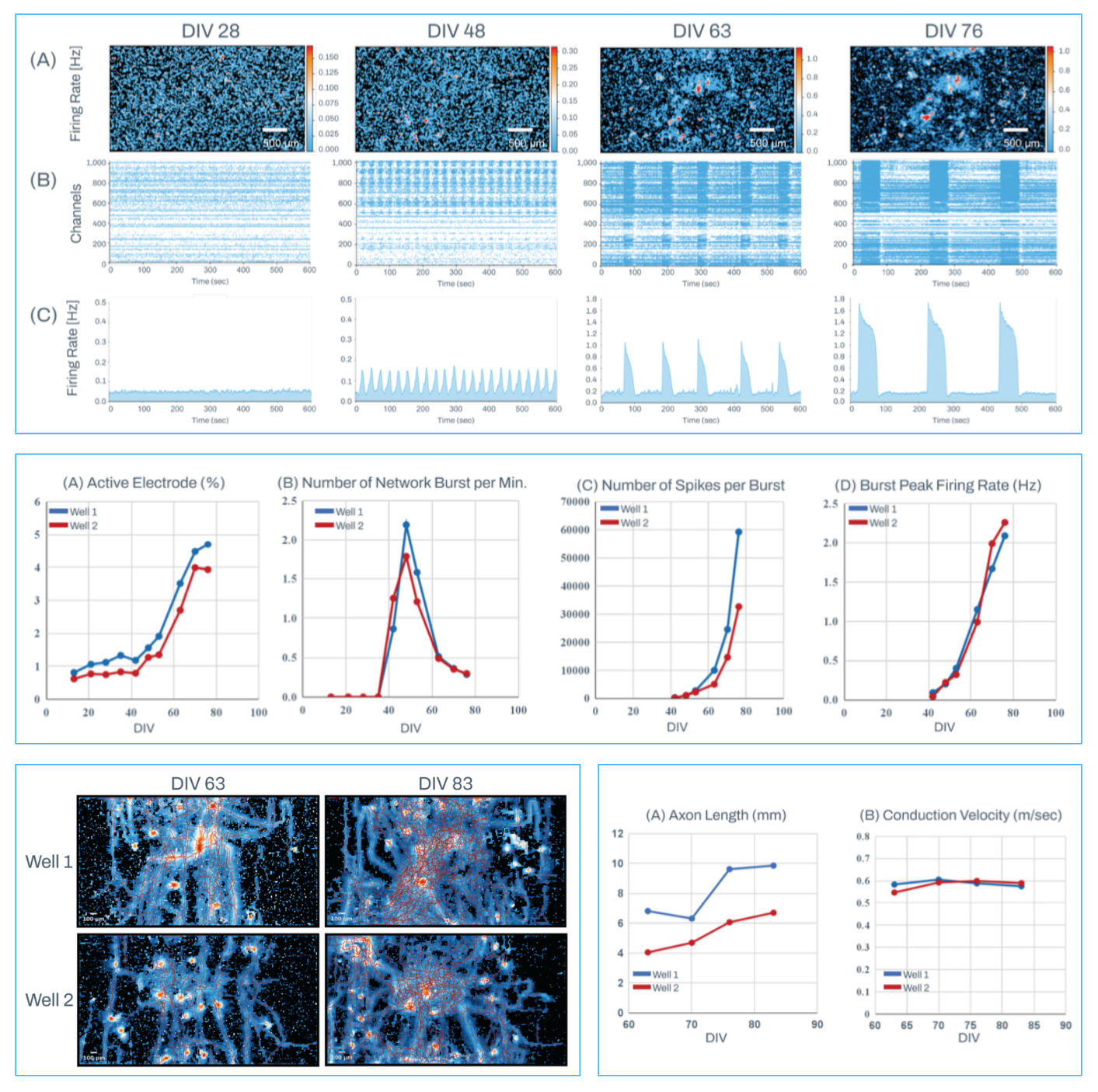 Bottom: AxonTracking Assay maps visualize action potential amplitudes and axonal branching at DIV 63 and 83 (left). Time course of average axonal length and conduction velocity measured across independent wells (right).