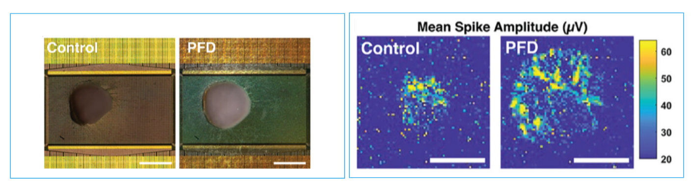 Image of cerebral organoid on HD-MEA before and after addition of PFD (left). Scale bar: 1 mm. Representative map of mean spike amplitude from cerebral organoids before and after the addition of PFD (right). Scalebar: 0.5 mm.