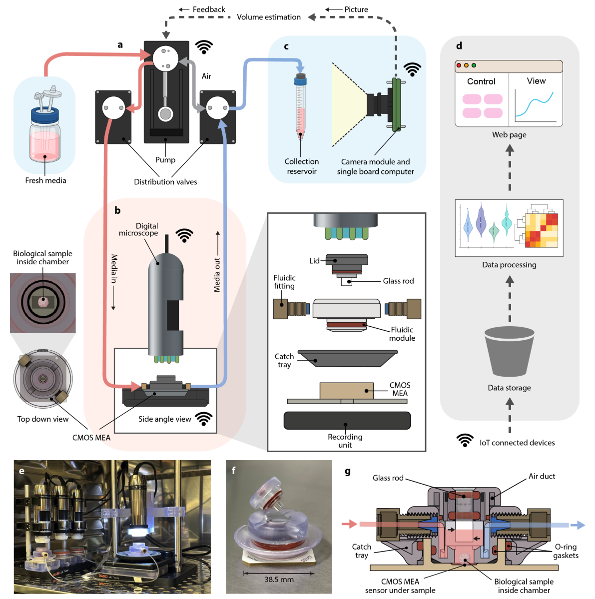 This automated organoid platform integrates programmable fluidics and HD-MEA recording for remote, real-time experimental control. (a) Fresh media and air are delivered by pumps and valves; (b) samples are maintained and imaged inside a sealed chamber; (c) sensors and cameras enable feedback-driven monitoring; (d) all data is processed and accessed via a web portal. (e) The system setup is shown in an incubator; (f) the compact chamber design; and (g) a cross-section detailing fluid flow and sample placement. The system supports continuous, high-resolution data collection for brain organoid cultures.