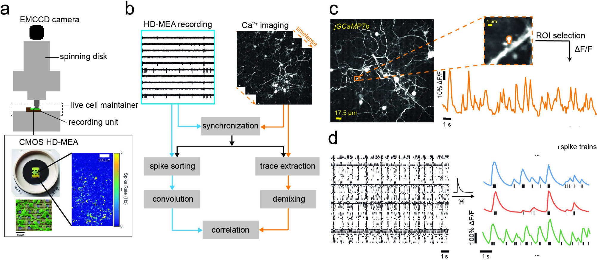 (a) Experimental setup combining upright confocal calcium (Ca2+) imaging and HD-MEA recording on live neurons. (b) Analysis pipeline for synchronizing and correlating spike and Ca2+ signals, including spike sorting and trace extraction. (c) Example region of interest containing a selected dendritic spine, with corresponding calcium trace. (d) Raster plot of spike trains and convolved traces, illustrating direct comparison of electrical and calcium activity.