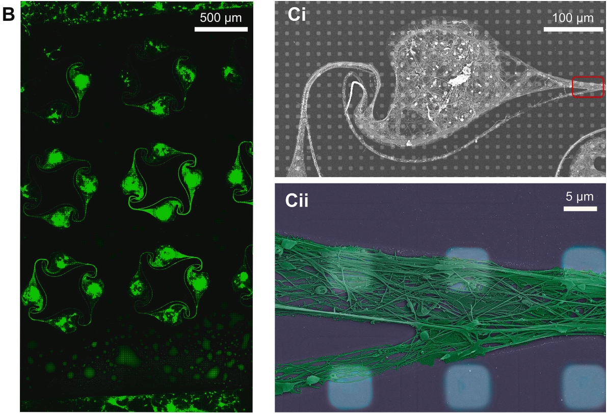 Primary rat cortical neurons are patterned within PDMS microstructures placed on HD-MEA chips, forming isolated neural networks suitable for precise electrophysiological analysis. (B) Confocal image at DIV 8 shows discrete cell clusters within microstructures. (Ci) Scanning electron micrograph (SEM) depicts a network node on the electrode grid at DIV 8; (Cii) false-colored SEM image highlights axonal bundles confined inside microchannels. Electrode coverage supports recording of activity at subcellular resolution within defined compartments.