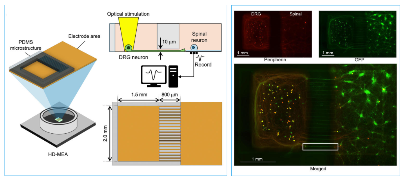Left: Schematic shows PDMS microstructures positioned on HD-MEA chips, enabling separate culture of DRG and spinal neurons connected by microtunnels. Optical stimulation is used to activate individual DRG neurons expressing Channelrhodopsin-2, while spinal neuron responses are recorded.