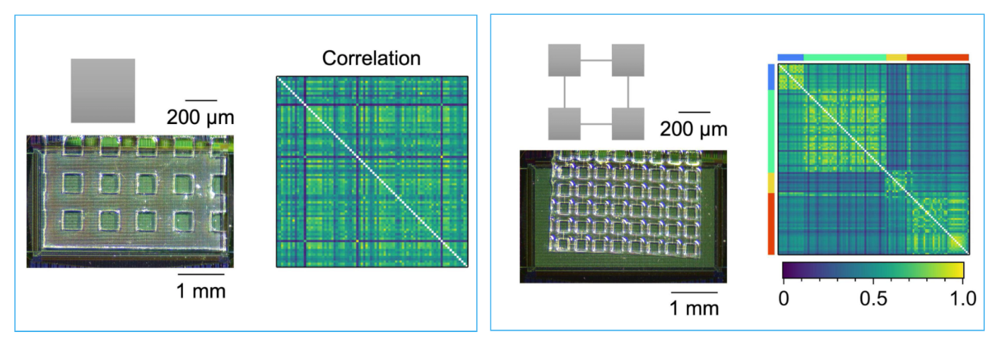 This study examines spontaneous activity and functional connectivity in engineered modular and random networks cultured on HD-MEA chips. PDMS microfluidic geometry defines modular structures, allowing direct comparison of compartmentalized and distributed network interactions through high-resolution correlation mapping. The dense, full-area electrode coverage enables reliable capture of functional regions, including microcompartments, without the need for fine alignment. Read more in Sato et al., Frontiers in Neuroscience, 2023.