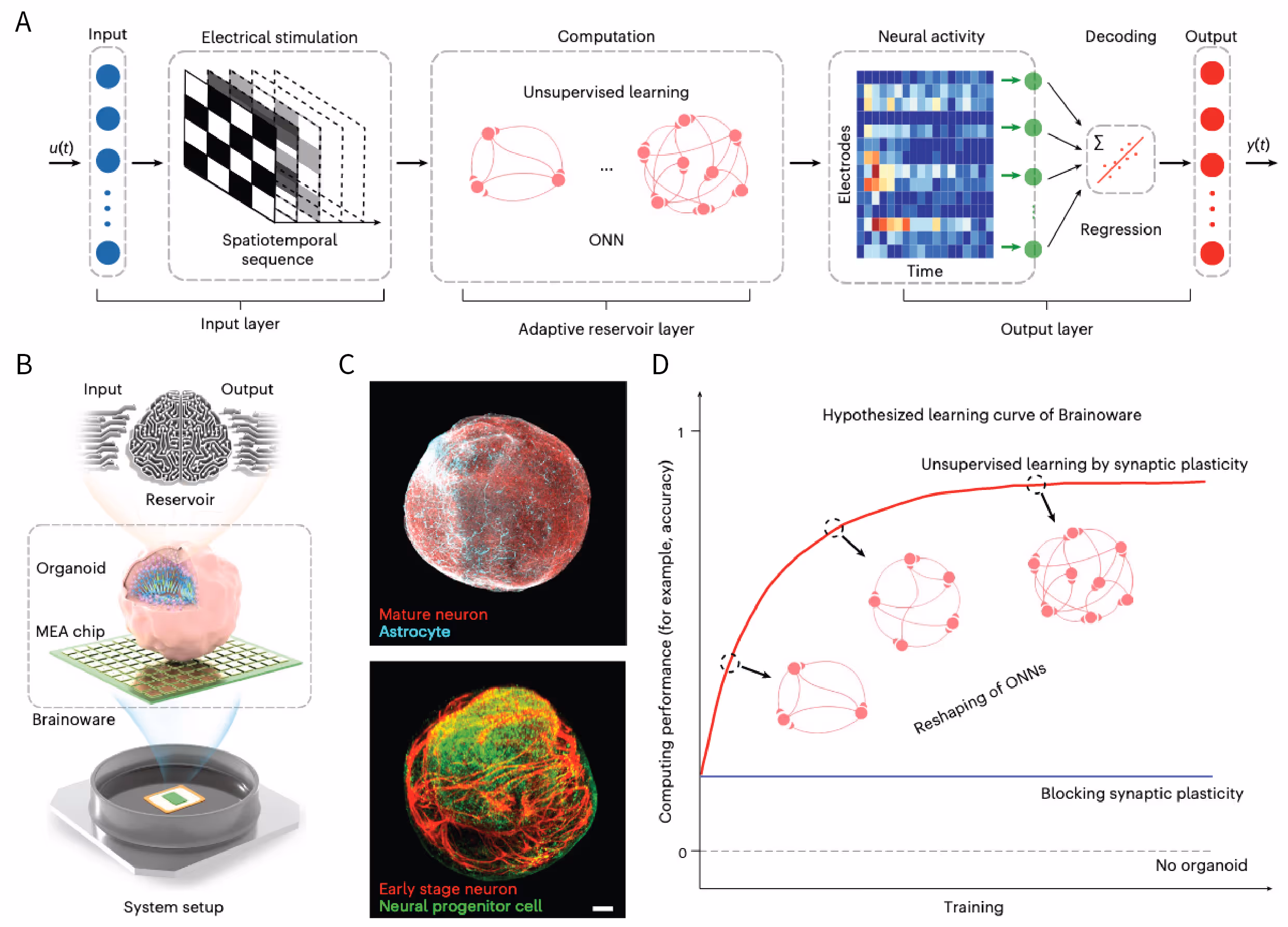 This study demonstrates how cortical organoids plated on HD-MEAs can act as a living reservoir for neurocomputing tasks called Brainoware. Spatiotemporal electrical inputs are delivered to the organoid, generating complex responses recorded at high resolution across thousands of electrodes. By decoding evoked activity using machine learning, the system achieves classification, prediction, and adaptive computation in vitro. This approach leverages precise interaction with every cell in the network, enabling detailed studies of information processing and unsupervised learning in brain-inspired computing frameworks. In one application of the Brainoware framework, it was trained on speech recognition tasks, successfully identifying the correct speaker from different audio clips.Read more on Cai et al., Nature Electronics, 2024.