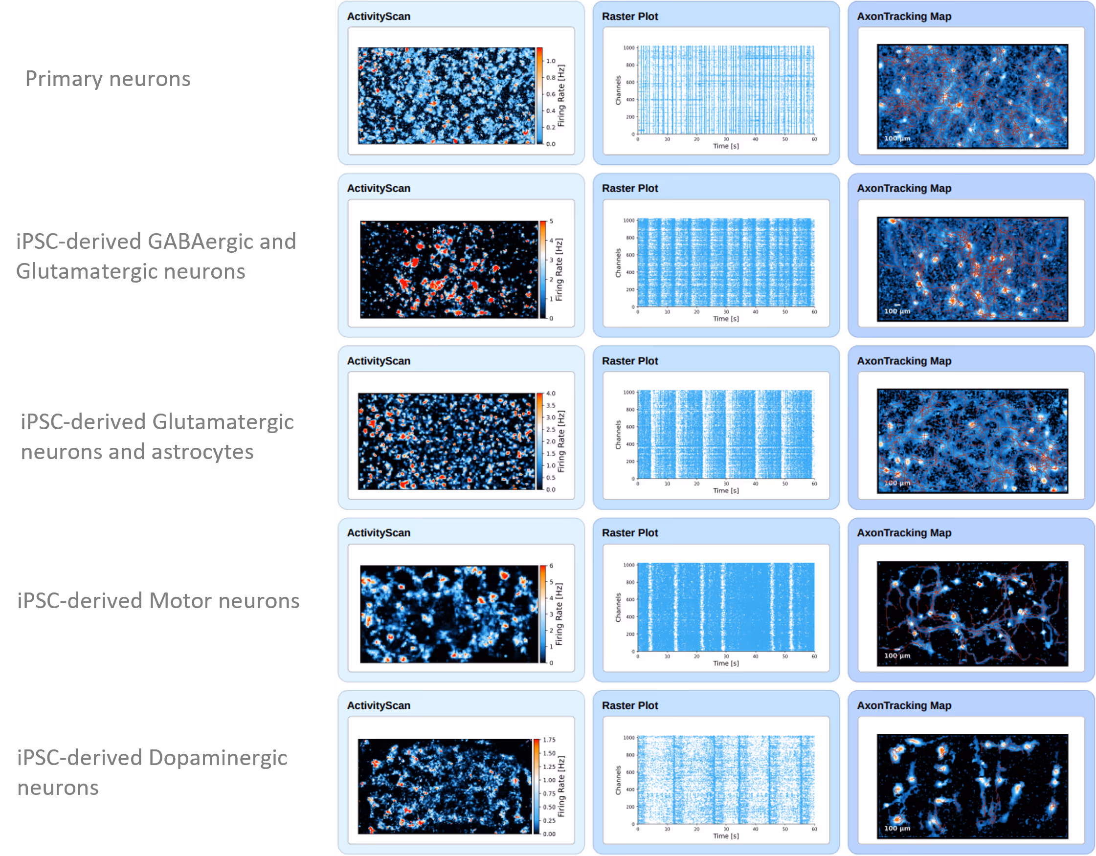 For every neuronal culture model, our HD-MEA Systems are designed to reveal their full functional profile. A range of neuronal cultures are characterized at different levels, from activity across the whole sample at single-cell resolution, population network dynamics, to electrically reconstructed axonal branches, unique to users of our HD-MEA technology.