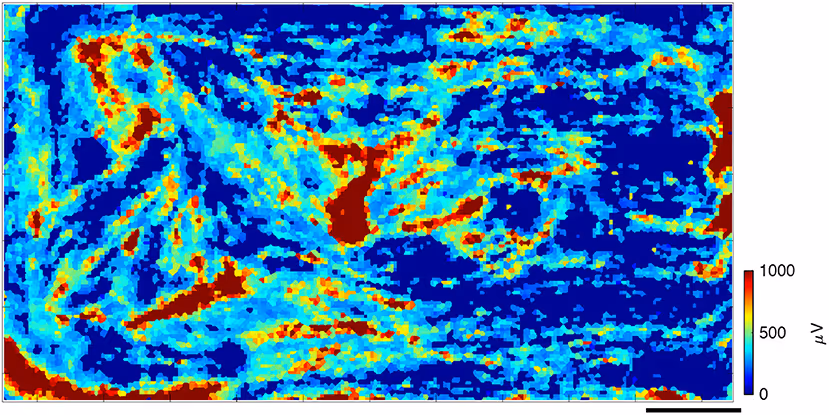 The video shows a time-lapse of a spontaneous burst traveling across the electrode array, where the activation of the single cells is color-coded depending on the amplitude, revealing the direction and speed of activation.