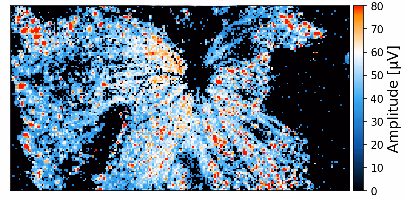 The sensing area of MaxWell Biosystems’ MaxOne Single-Well and MaxTwo Multi-Well HD-MEA Systems capture a significant portion of the rodent retina. Heatmaps presenting the spontaneous activity of a representative freshly dissected retina explant are shown.