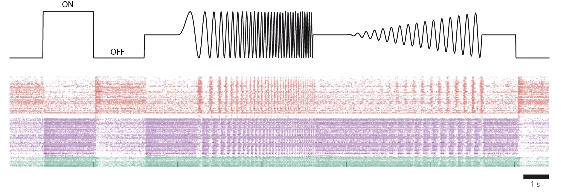 Identify and functionally dissect specific RGC populations, based on their light-evoked response, thanks to our HD-MEA technology. Four populations of RGCs are highlighted, each with a unique response profile to the light stimulus provided.