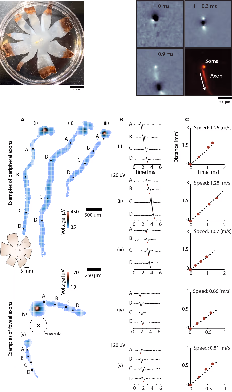 Bottom: (A) Electrical images of representative RGC axons from peripheral (top) and foveal (bottom) regions. Peripheral RGC axons project toward the optic disc in near-linear paths, while foveal RGC axons follow curved trajectories around the foveola. Colored squares indicate electrodes detecting action potentials, with color denoting voltage amplitude. (B) Average action potential waveforms recorded at increasing distances from the soma at the selected sites shown in A as black squares. (C) Axonal action potential propagation speed for the different RGCs in A.