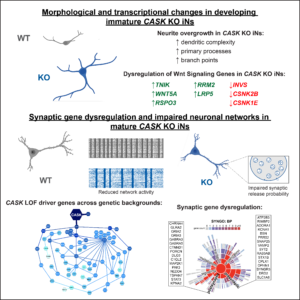 Multiple protein kinases serve as essential players during neuronal maturation, and synapse formation and maintenance. Human mutations in these genes are apparent in patients with severe neurodevelopmental disorders, thereby affecting a large percentage of the human population. One neurodevelopmental disease-associated protein kinase we are currently studying is called CASK (Calcium/Calmodulin Dependent Serine Protein Kinase). We recently reported that loss-of-function (LOF) mutations of CASK differentially regulate neuronal maturation and synaptic function in human induced cortical excitatory neurons (McSweeney et al., 2022, iScience). CASK LOF induces neuronal outgrowth in early maturing cells, suggesting that CASK functions to restrict dendritic morphogenesis at this developmental time window. Transcriptomic analysis of CASK LOF immature neurons revealed that these KO cells resemble morphology and gene expression programs associated with hyperactivated WNT signaling pathway.