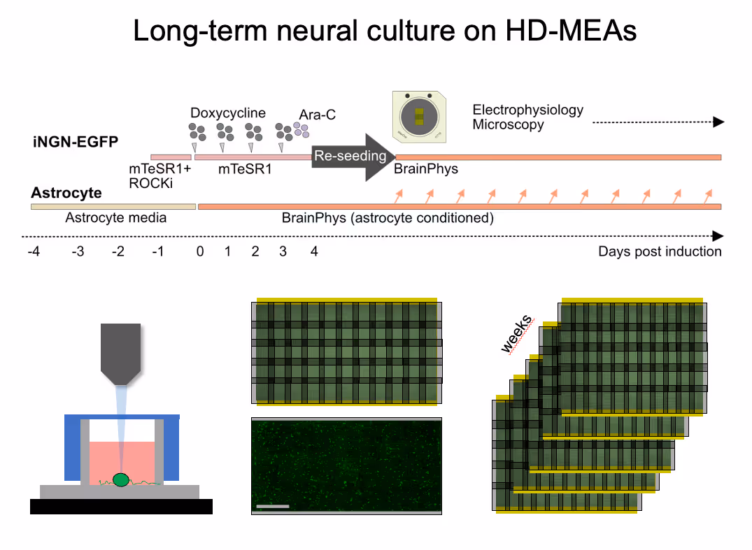 We are using the MaxOne HD-MEA system to characterize long-term functional features of the engineered neurons and neuronal networks derived from human induced pluripotent stem cells (hiPSC). We combine long-term microscopy readouts with electrophysiology recordings to track morphology and function in developing human neuronal circuits over months. This data is exploited to estimate how neuronal cell movement and dynamic changes on network morphology can affect the functional output (functional phenotype) of growing networks.