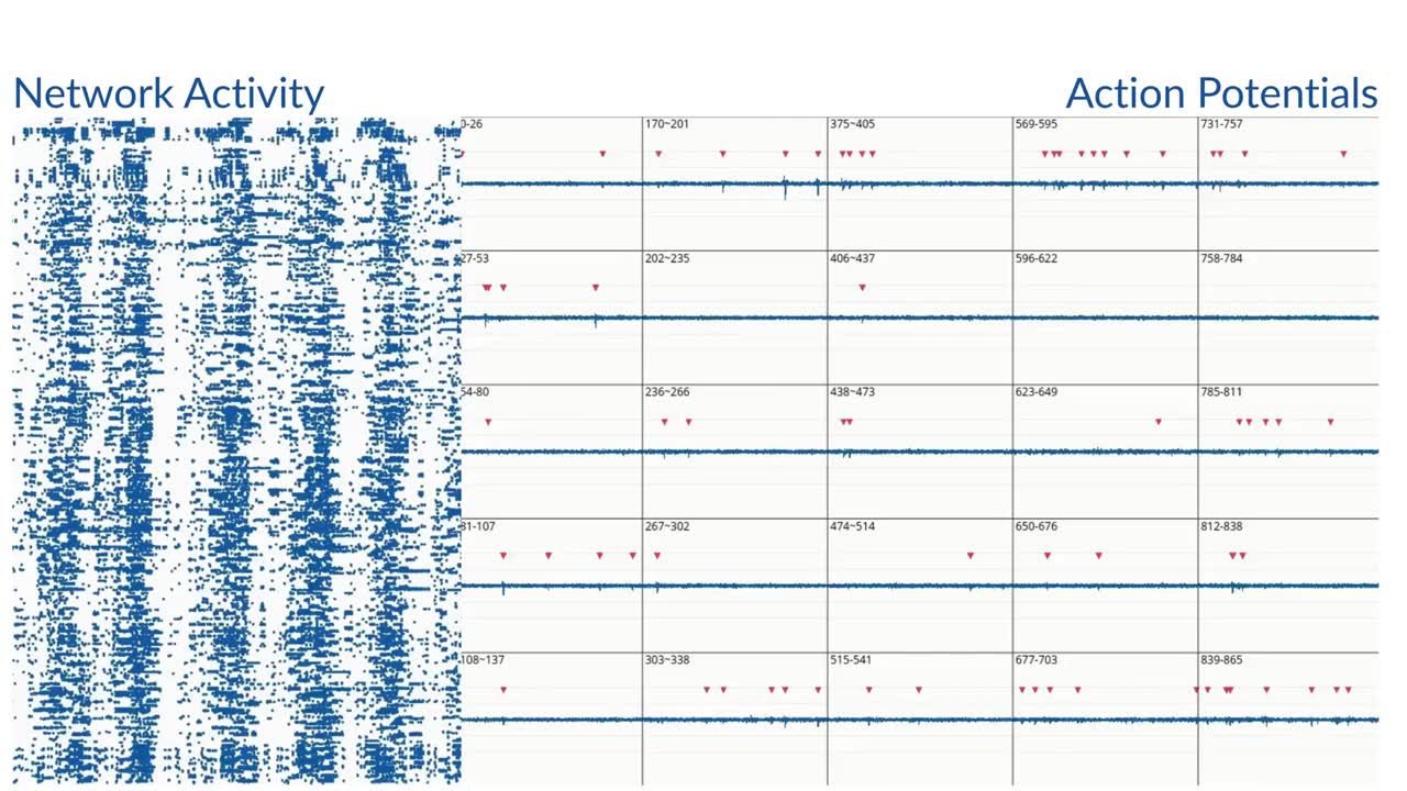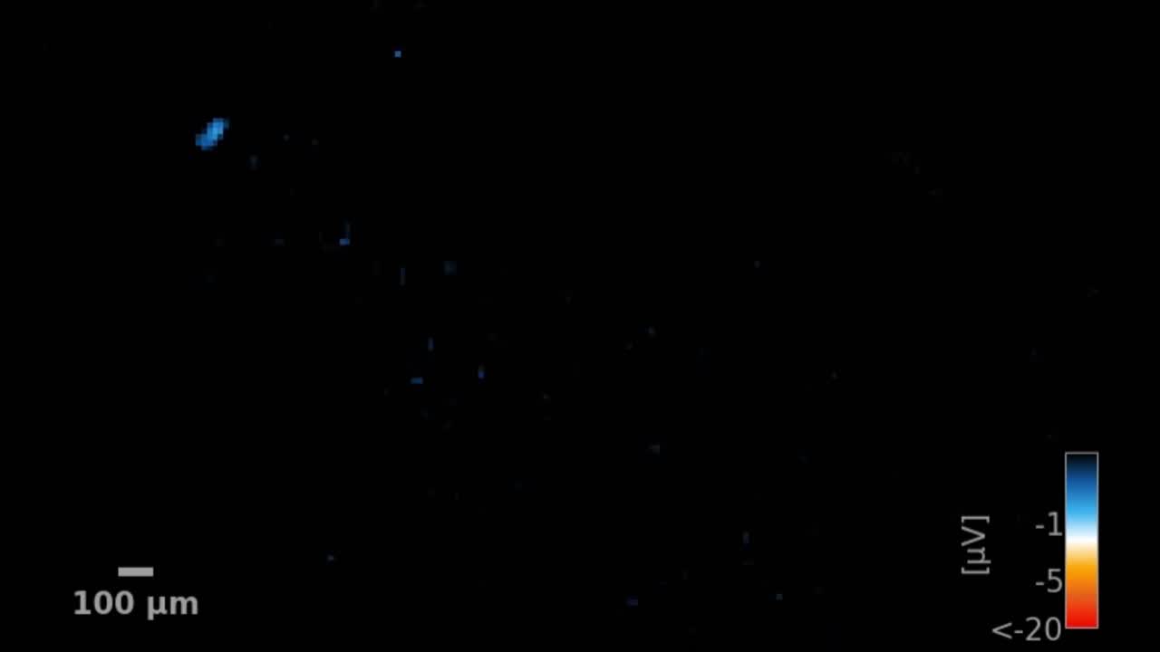 Axonal action potentials from single neurons propagating across the MEA, recorded at high resolution.