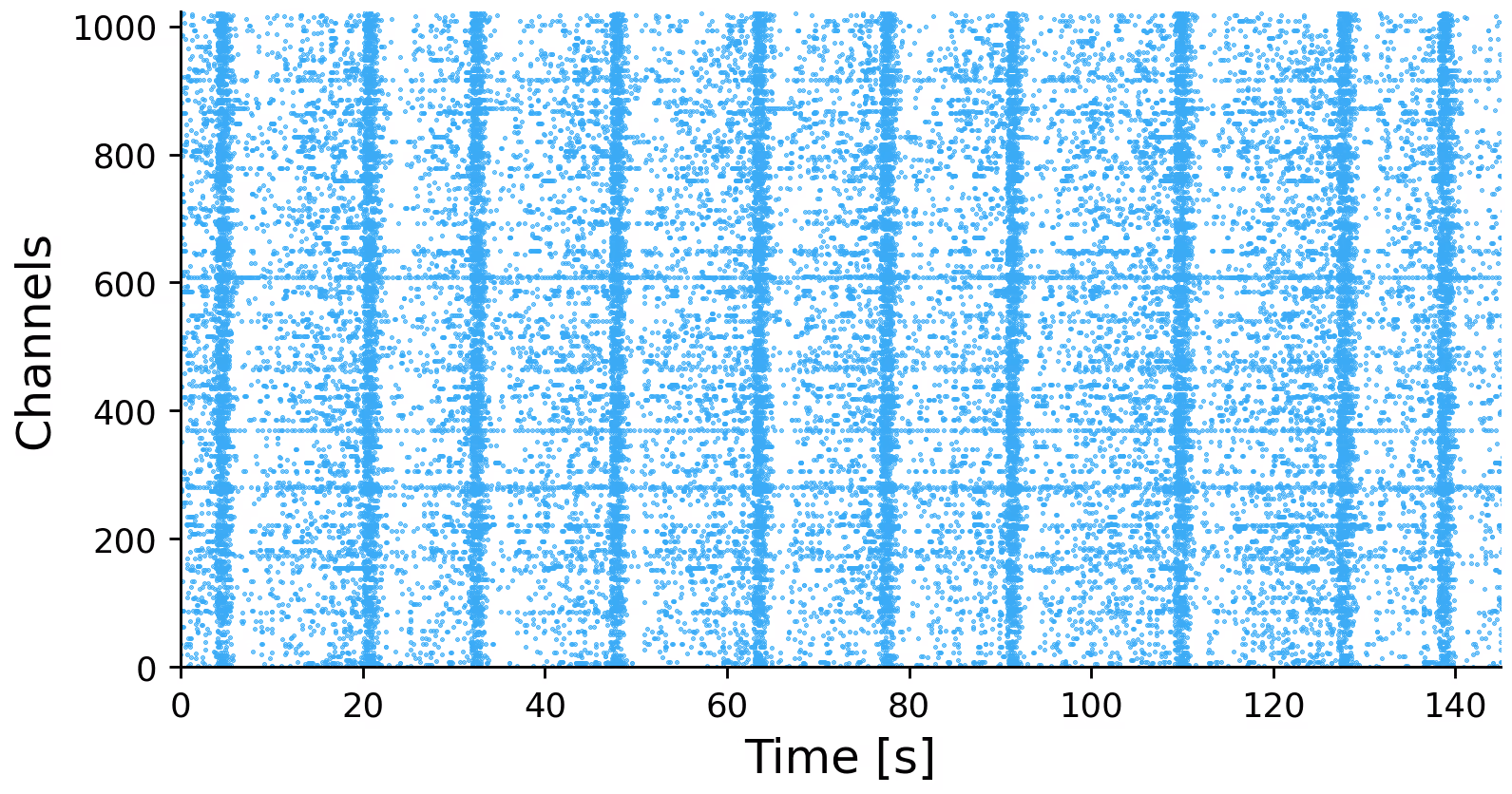 Raster plot of neural activity. Each blue dot marks a spike on a given recording electrode. This reveals overall firing dynamics across recorded neurons.