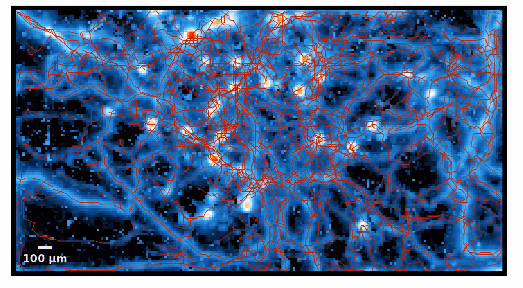 Multiple neurons recorded with the Axon Tracking Assay. Contour maps show their detected signals, with red lines indicating action potential propagation along axonal arbors.