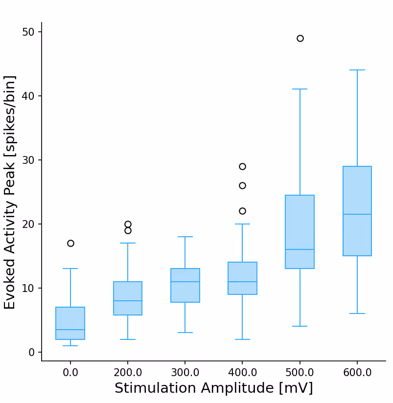Box plots illustrating how evoked response strength varies with stimulation amplitude. Stronger stimulation elicits stronger neural activity.